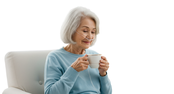 Senior Woman Enjoying Coffee with Nasal Cannula | Elderly Patient Relaxing with Hot Drink in a Chair for Healthcare Marketing and Assisted Living Concepts