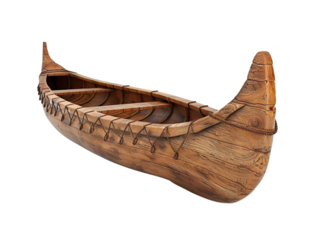 A beautifully crafted wooden canoe showcasing intricate details and traditional design, perfect for nature and adventure themes.