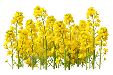 A close-up of bright yellow canola flowers, showcasing their delicate petals and green stems, isolated on a white background. PNG