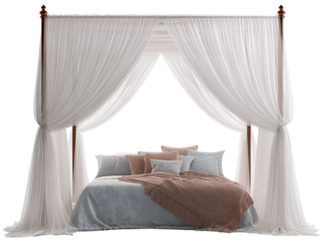 Experience restful slumber in a handcrafted wooden canopy bed draped in sheer white fabric a on transparent background