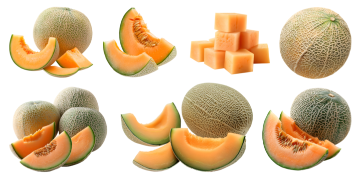 Cantaloupe cantaloupes melon fruit, many angles and view side top front sliced halved group cut isolated on transparent background cutout, PNG file. Mockup template for artwork graphic design