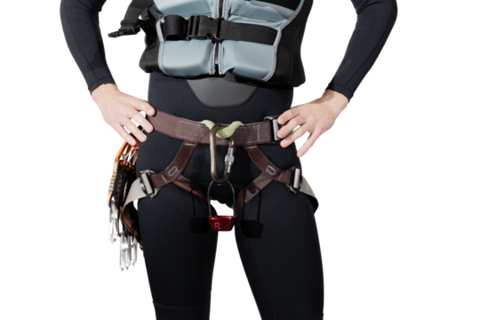 Man wearing climbing gear a black full wetsuit and buoyancy aid with a harness, belay device atc carabiners, and quickdraw climbing carabiners with hand on hips on an isolated white background.