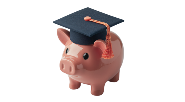 Graduation cap on piggy bank symbolizes education, created with AI, PNG