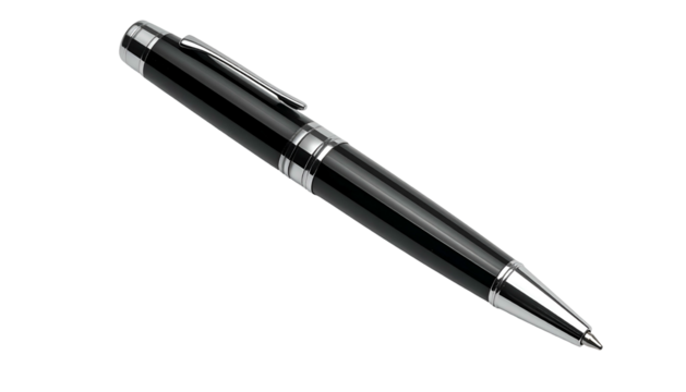 A sleek, black pen with silver accents, clip, and writing tip, against a black backdrop