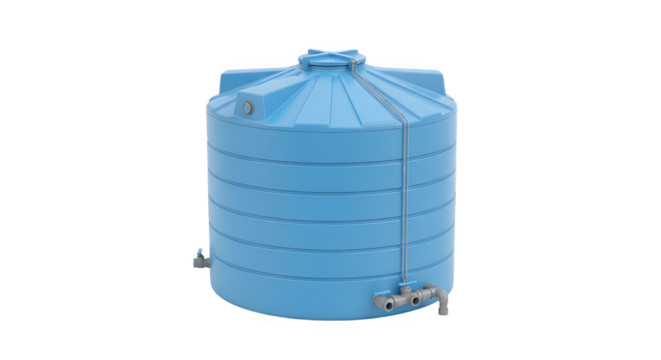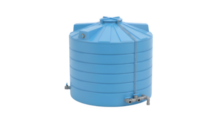 Blue plastic water storage tank with fittings isolated on transparent background
