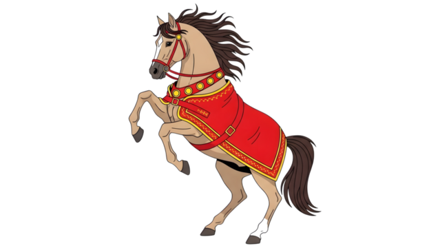 Rearing horse in decorative red and gold caparison illustration isolated on transparent background