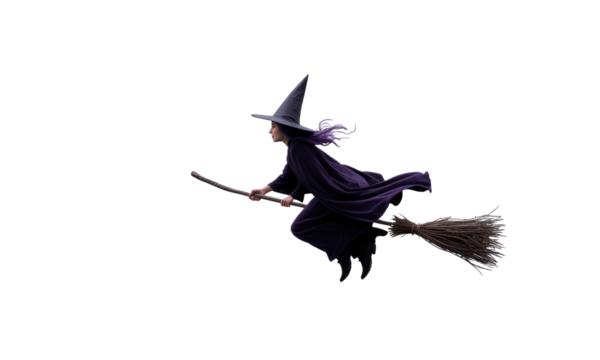 Witches black pointy hat with a purple satin ribbon band and a prominent golden buckle a perfect accessory for any halloween costume or display isolated on transparent background