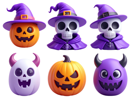 Six Vibrant 3D Plastic Halloween Icons Set Purple Cape Skeleton Shirt Witch Hat Ghost