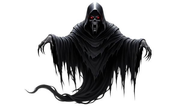 Fluffy black cat wearing a witch hat and cape isolated on transparent background