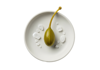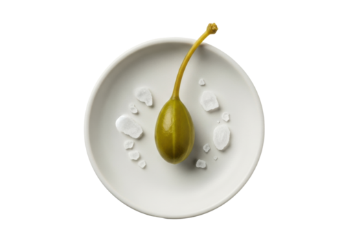 A green caper berry on a light cream ceramic dish with sea salt flakes, pure transparent background, diffused studio lighting, macro photography, concept of culinary refinement