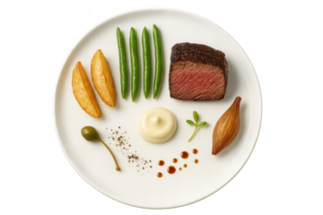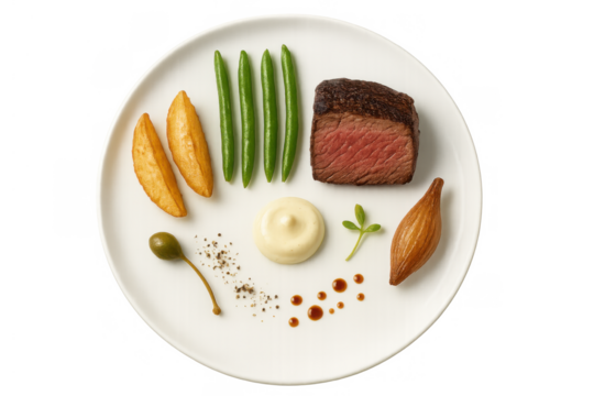 Steak meal plated with a medium-rare filet mignon, crisp green beans, golden potato wedges, and gourmet sauces