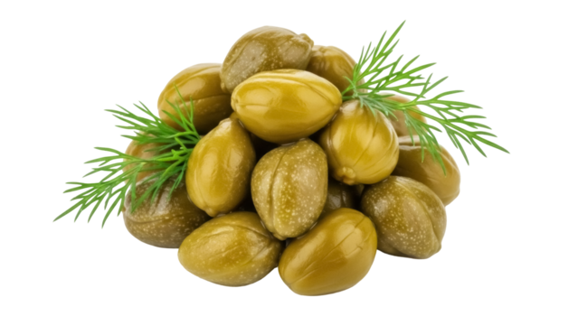 Pile of green caper berries with dill PNG isolated on transparent background, pickled flower buds for Mediterranean cuisine