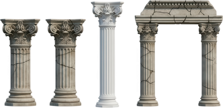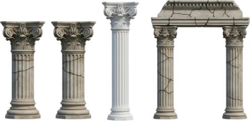 Collection of Corinthian style stone columns and a complete archway with weathered cracked surfaces and ornate capitals ancient architecture classical ruin structure weathered stone transparent