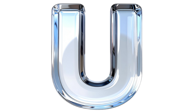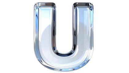 A 3D rendered, transparent, capital "U" with a glossy chrome-like texture, on a black background. The letter reflects light, appearing bright and shiny