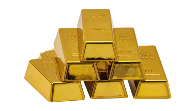 Stack of gold bars, shiny, yellowish metal, arranged on a black background