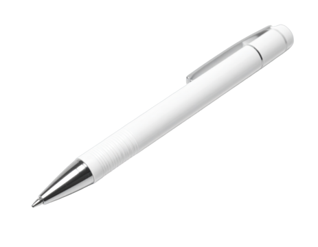 White ballpoint pen, cap on, silver tip, angled