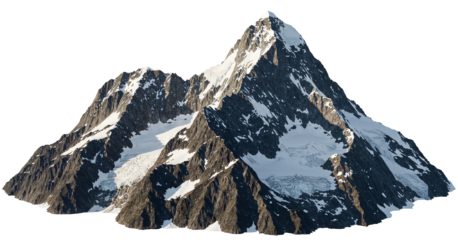 Snow capped mountain peak rising, isolated rock formation with rugged texture, nature and geology concept, transparent background
