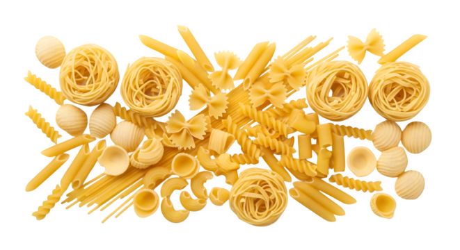 Various types of dry pasta, including spaghetti, penne, farfalle, fusilli, and conchiglie isolated on transparent background for culinary creations