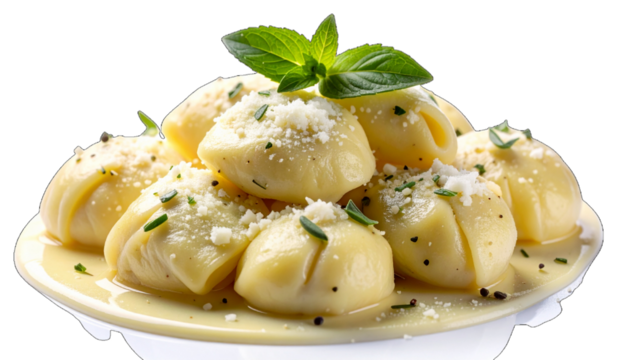 Plate Of Cheese Ravioli With Basil And Black Pepper. Italian Cuisine And Gourmet Dining Concept Isolated On Transparent Background