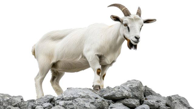 White mountain goat standing on rocky terrain isolated on transparent background. Mountain goat isolated on white background.