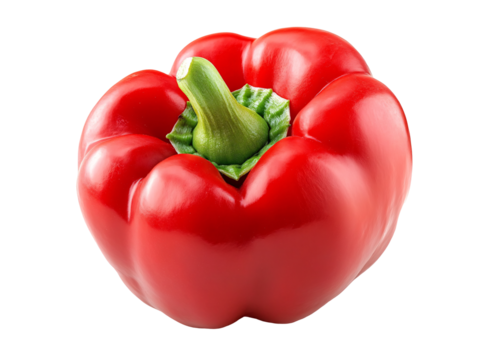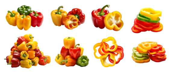 Red yellow green Capsicum bell pepper fruit vegetable, many angles and view side top front group slice cut on transparent background cutout, PNG file. Mockup template for artwork graphic design