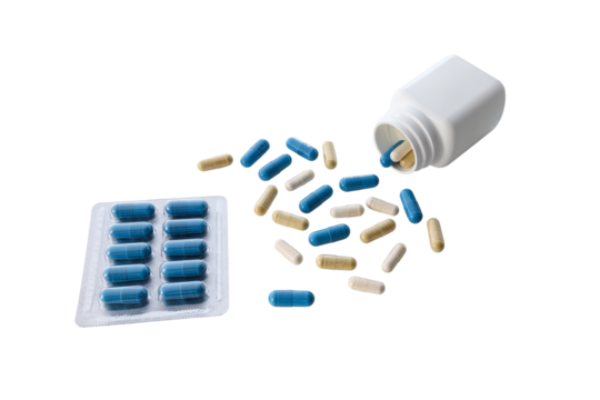 Medicine capsules in blister pack and remedy pills in bottle, pharmaceutical cure, antibiotics or painkillers isolated on transparent background