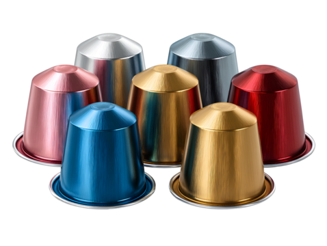 Two yellow capsules with ground coffee, for a capsule coffee machine, on a white background, one capsule is overturned, isolate