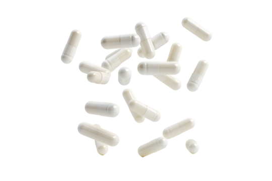 White medical capsules or pills for treatment isolated on transparent background, medicine and healthcare concept, close-up view