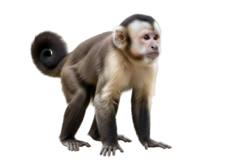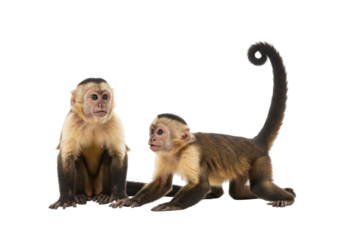 Isolated capuchin monkeys, one sitting, one moving with a curled tail on no background