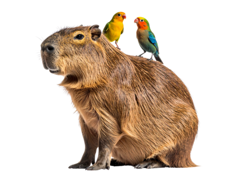 Capybara Sitting Calmly with Birds Perched on Its Back, isolated on a transparent background