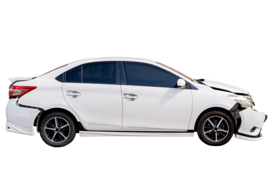 Car crash, Side view of white sedan car get damaged by accident on the road. damaged cars after collision. isolated on transparent background,car crash bumper for graphic design, PNG File