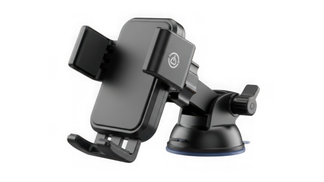 Adjustable car phone holder mount with suction cup for dashboard or windshield isolated on transparent background