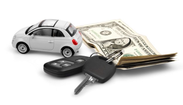 A hand holding car keys with a red key fob, isolated on a white background, cut out