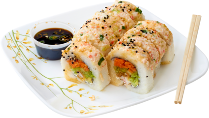 Transparent sushi plates with fresh salmon sashimi and rolls