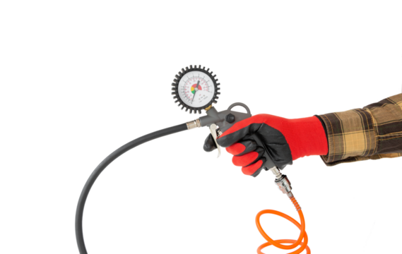 Manometer for car tyre pressure setting in the hand of a worker, cut out