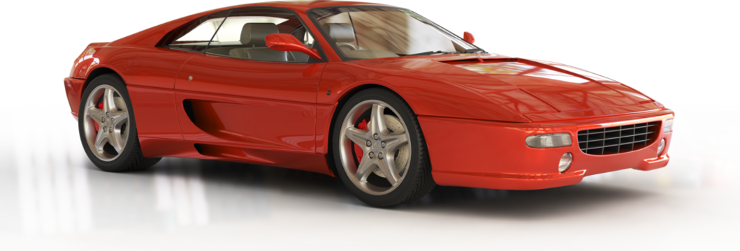 A fast, new red sports car races toward the finish line