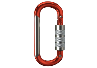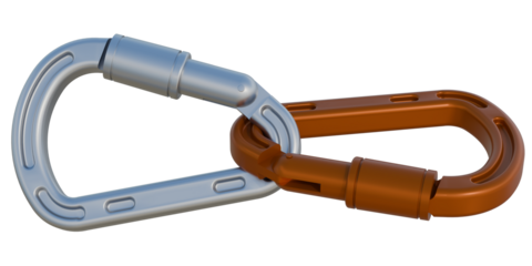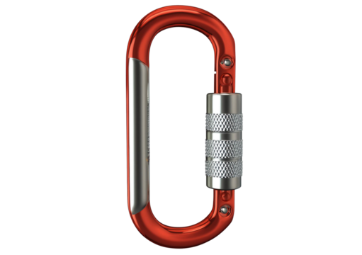 tourist carabiner in hand, outstretched hand with tourist carabiner isolated from background