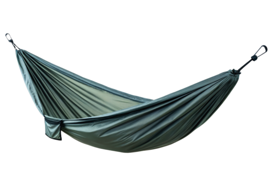 Green nylon travel hammock with carabiners for outdoor camping isolated with transparent background