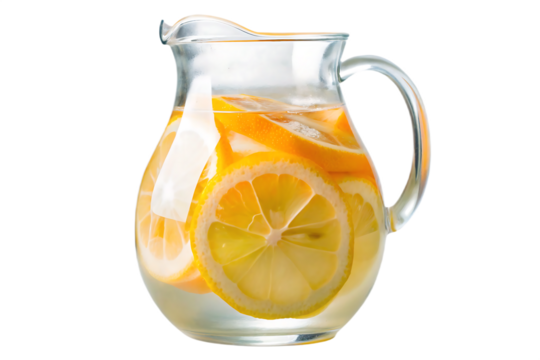 Glass pitcher with lemon and orange slices isolated on a transparent background carafe