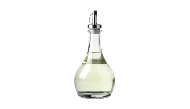 Glass olive oil cruet with cork stopper isolated PNG, traditional dispenser for kitchen and dining on transparent background