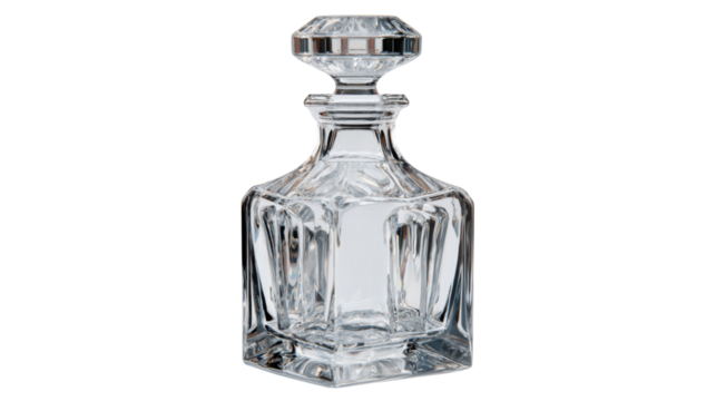 Crystal decanter with stopper, empty and transparent, showcasing luxury and elegance for spirits presentation