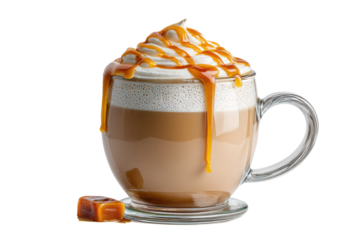 A warm latte macchiato with a swirl of caramel, served in a tall glass with a handle, Transparent background, PNG file