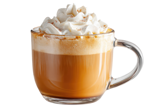 A cup of coffee with milk foam and caramel topping in a glass mug with a handle against a transparent background.