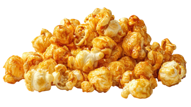 Crispy caramel popcorn, golden sweet glaze detail, isolated on tranparent background