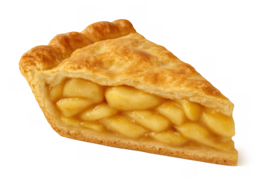 Golden-brown apple pie slice revealing caramelized filling, crust flaking, served on transparent background