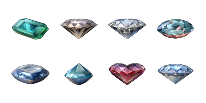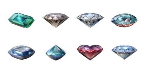 Collection of eight beautifully cut and polished gemstones featuring various shapes and vibrant colors on transparent background