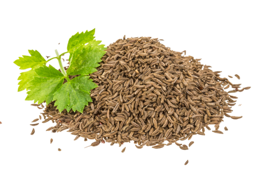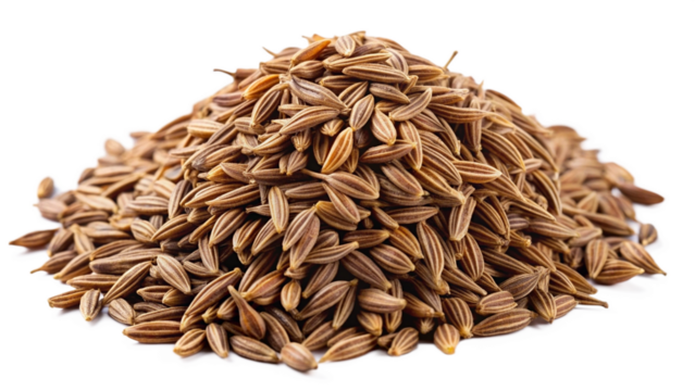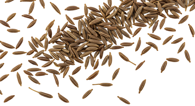 close-up of a pile of organic dry cumin seeds isolated on a transparent background without shadows from above, top view, png