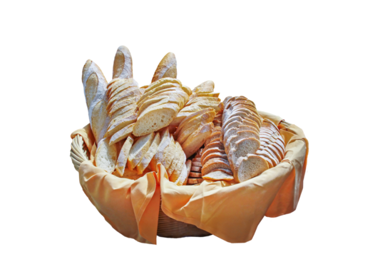 Basket of fresh baguette bread isolated on white or transparent background, png cut out