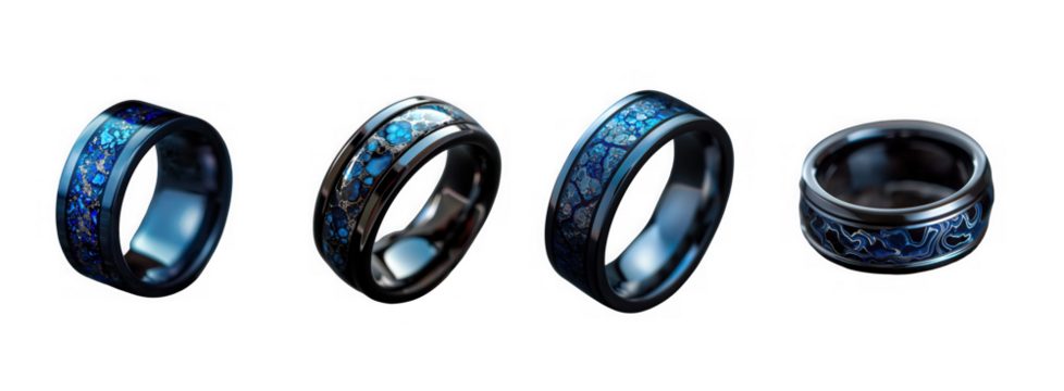 Four views of a blue and silver tungsten carbide wedding ring isolated on transparent background
