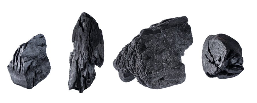 Charcoal, bituminous coal, realistic bamboo coal or carbon powder splash. Png transparent  background. Black charcoal explosion in macro closeup of floating coals with dust cloud